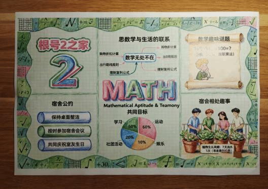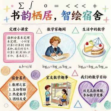 在“书韵栖居,智绘宿舍”手抄报设计环节,同学们将数学专业知识与宿舍文化深度融合,创作出一幅幅兼具知识性、观赏性与感染力的作品。手抄报内容丰富多元,既包含趣味数学谜题、经典定理公式、数学家励志故事等专业相关内容,又融入了宿舍名称、宿舍公约、室友相处趣事、集体奋斗目标等专属元素。有的以“学海共济,韶华共勉”为主题,展现宿舍成员携手奋进的学习氛围;有的通过图文结合的方式解读数学定理,让严谨的学术知识变得生动易懂;有的详细列出宿舍卫生值日、作息规范等公约条款,彰显共建文明宿舍的决心。作品设计精美、排版合理,充分展现了数院学子扎实的专业基础、良好的文化素养与出色的创新能力,进一步丰富了宿舍文化的内涵与外延。
