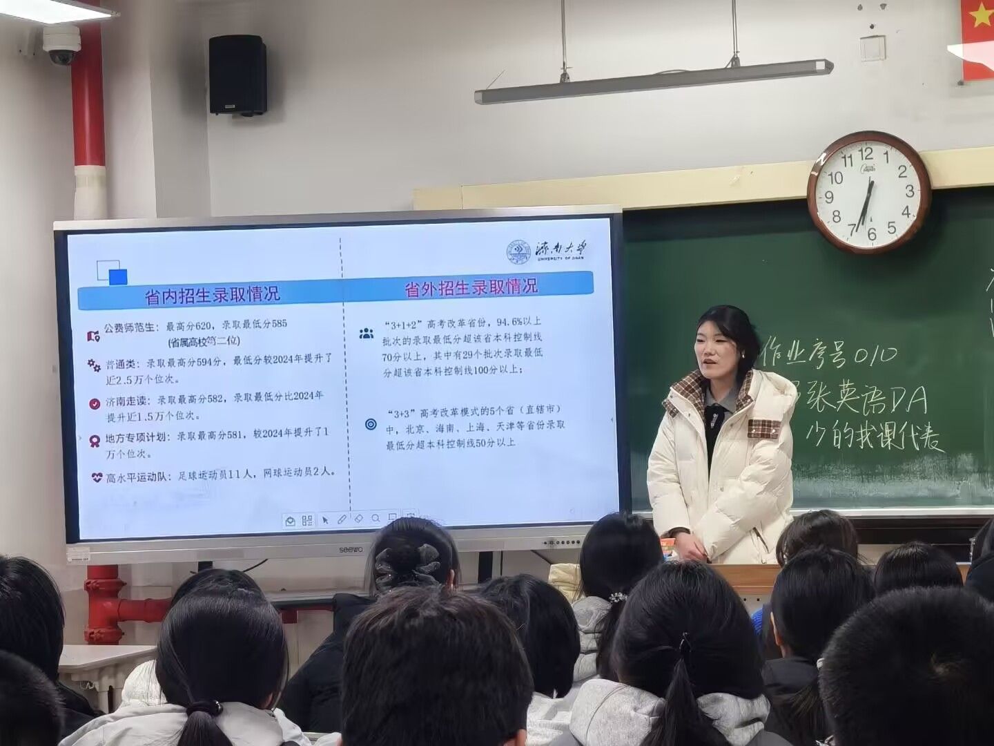 活动中,实践队成员重返高中母校,拜访昔日恩师,汇报自己在济南大学的学习与发展情况,认真听取老师的建议与嘱托,并送上真挚的感恩与祝福。在面向高中学生的宣讲环节,队员们生动全面地介绍济南大学的整体风貌与育人氛围。此外,队员们结合自身经历,重点分享高中阶段的学习方法与备考策略,激发他们的学习动力。在互动环节,队员们还针对高考志愿填报、专业选择、大学生涯规划等话题进行细致解答,为迷茫中的高中学子指明方向。
