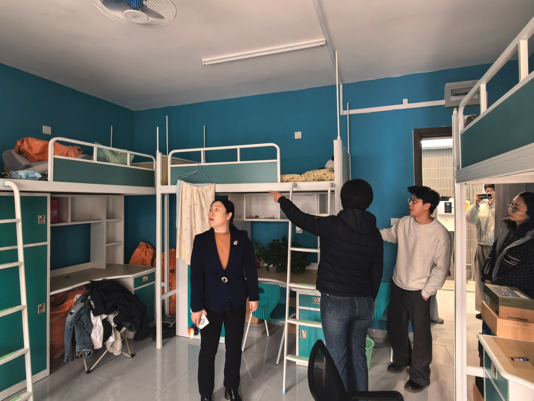 针对不同年级学生的特点进行精准关怀与指导。在研究生宿舍,老师重点询问同学们的课题研究进展、论文撰写情况以及未来的就业规划。在本科生宿舍,老师重点围绕宿舍内务整理、基础安全设施进行全面检查。老师耐心叮嘱低年级同学要养成良好的作息与卫生习惯,严格遵守晚归查寝等校纪校规,共同营造温馨和谐的生活环境。